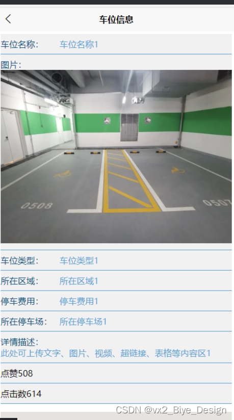 车位信息列表详情页面可查看车场名称、车场地址、车位编号、车位数量、所在层数、小时收费、车位图片等信息,如图5.11所示。