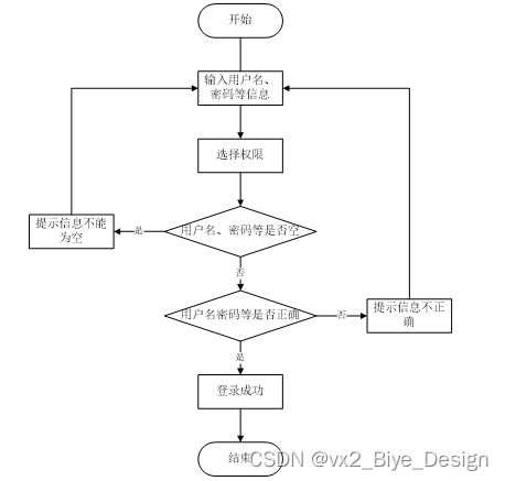 用户想进入系统,首先进入系统登录界面,通过正确的用户名、密码,选择登录类型登录,系统会检查登录信息,信息正确,然后输入相应的功能界面,提示信息错误,登录失败。系统操作流程如图3-4所示。