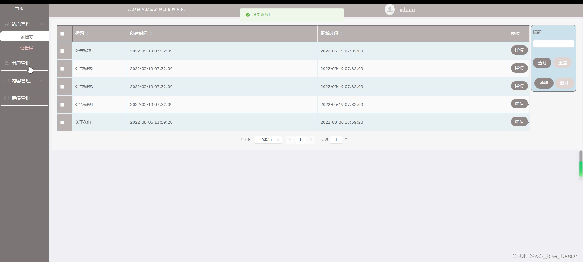 在管理员功能页面可以查看管理员:首页、站点管理(轮播图、公告栏)用户管理(管理员、志愿者、教师用户)内容管理(动态分享、动态分类、志愿新闻、新闻分类)更多管理(志愿活动、积分商城、活动报名、活动类型、活动签到、积分兑换、意见反馈、积分扣减、志愿者积分、积分增加)等内容进行相对应操作,如图5-9所示。