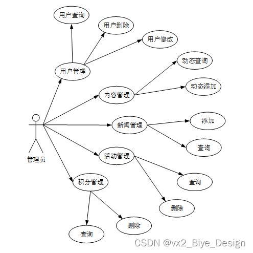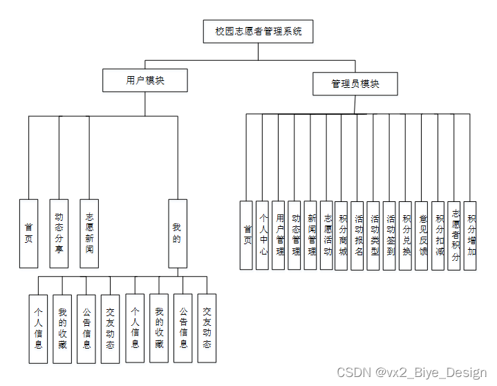 基于校园志愿者管理系统的设计基于现有的手机,可以实现管理员:首页、站点管理(轮播图、公告栏)用户管理(管理员、志愿者、教师用户)内容管理(动态分享、动态分类、志愿新闻、新闻分类)更多管理(志愿活动、积分商城、活动报名、活动类型、活动签到、积分兑换、意见反馈、积分扣减、志愿者积分、积分增加)等详细的了解及统计分析。根据系统功能需求建立的模块关系图如下图: