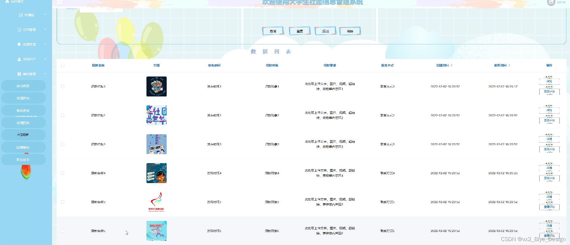 社团招新,在此管理页面可以社团招新活动行查询,重置,添加,删除等操作,如图5-7所示。