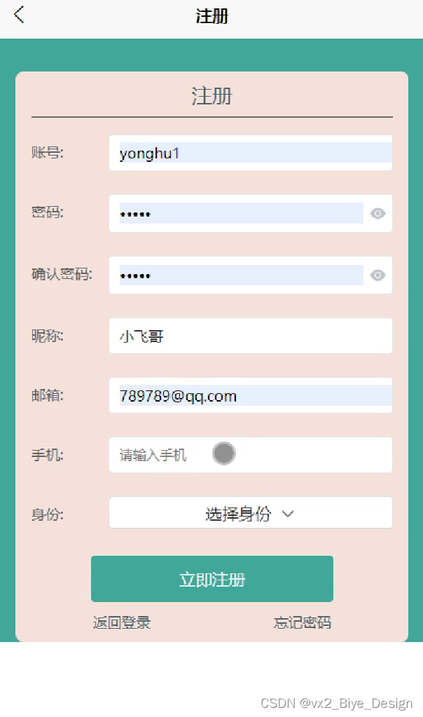 用户注册,通过填写账号、密码、昵称、邮箱等信息,输入完成后选择登录即可进入大学生社团信息管理系统APP,如图5-9所示。