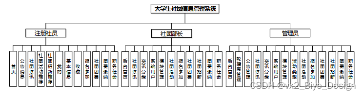 (1)功能要求:可以管理首页,轮播图管理,公告管理,资源管理(社团资讯,资讯分类),系统用户(管理员,注册社员,社团部长),模块管理(活动类型,社团活动,报名参加,社团团费,社团招新,团费缴纳,职务任命)等功能模块。