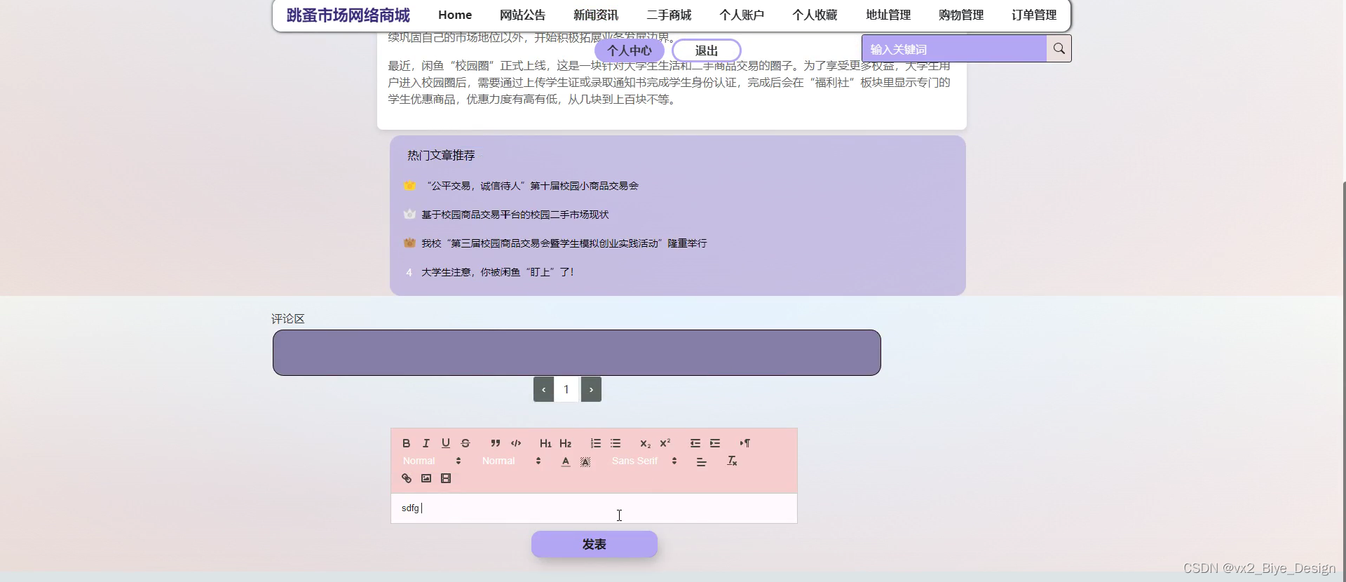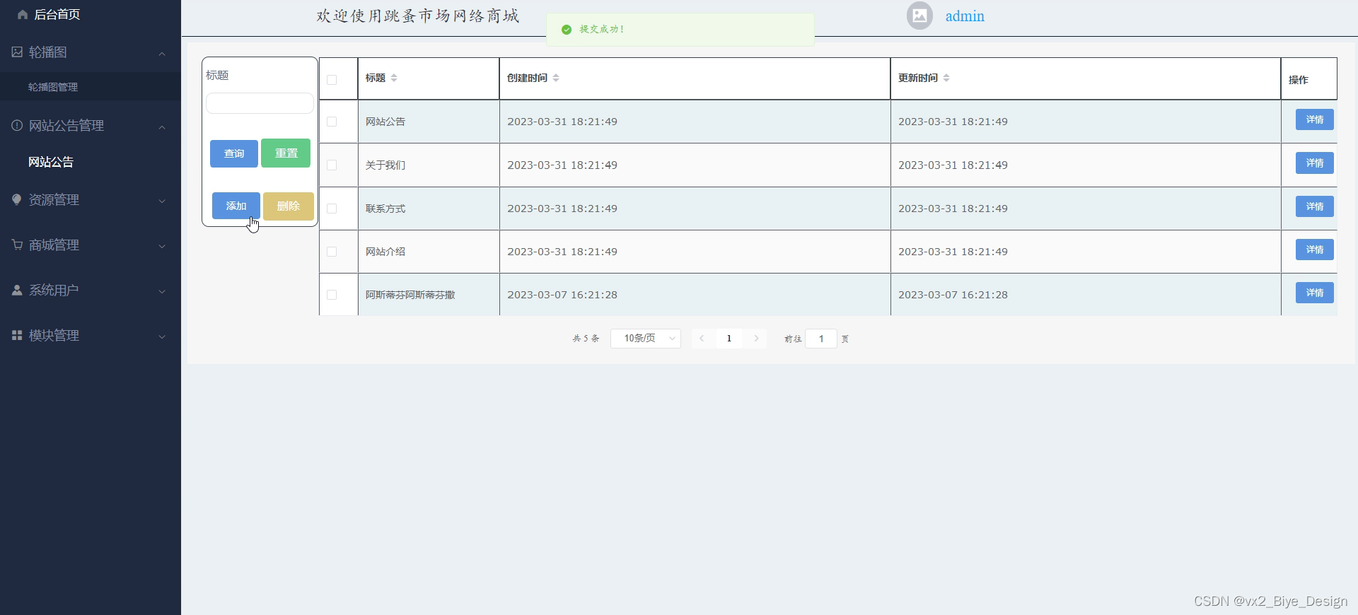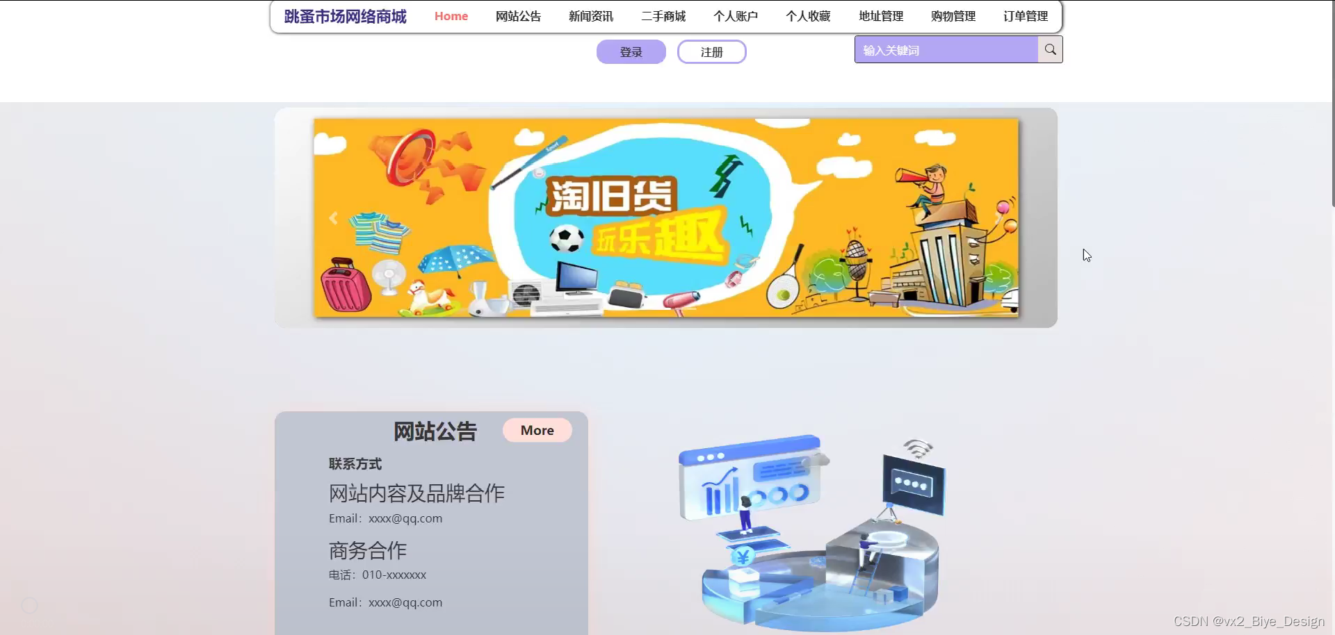 (1)网站公告管理:管理员可以对跳蚤市场网络商城中首页显示的轮播图以及系统中的一些公告发布到系统当中,让用户及时的查看到系统信息,进行合理安排。