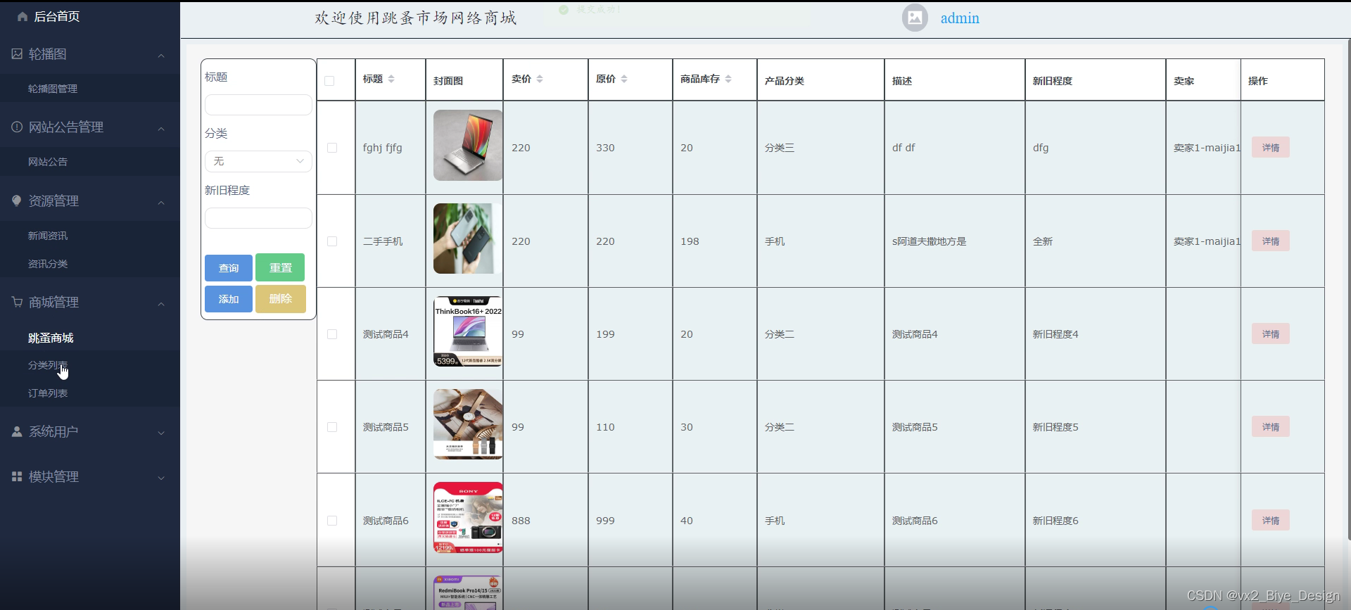 (4)二手商城管理:综合管理所属跳蚤市场网络商城中的所有的商品信息。