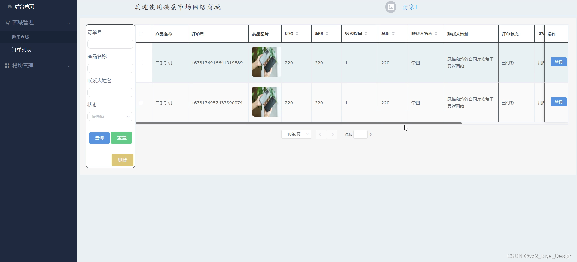 (2)订单信息:点击“订单信息”可以查看到买家用户购买的我的商品订单,对提交的订单进行管理。