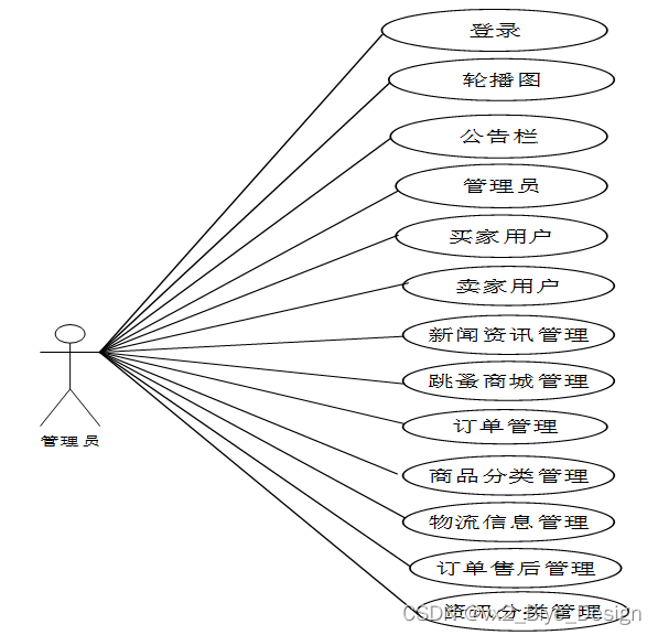 web后台管理上的管理员是维护整个跳蚤市场网络商城中所有数据信息的。管理员角色用例如图2-5所示。