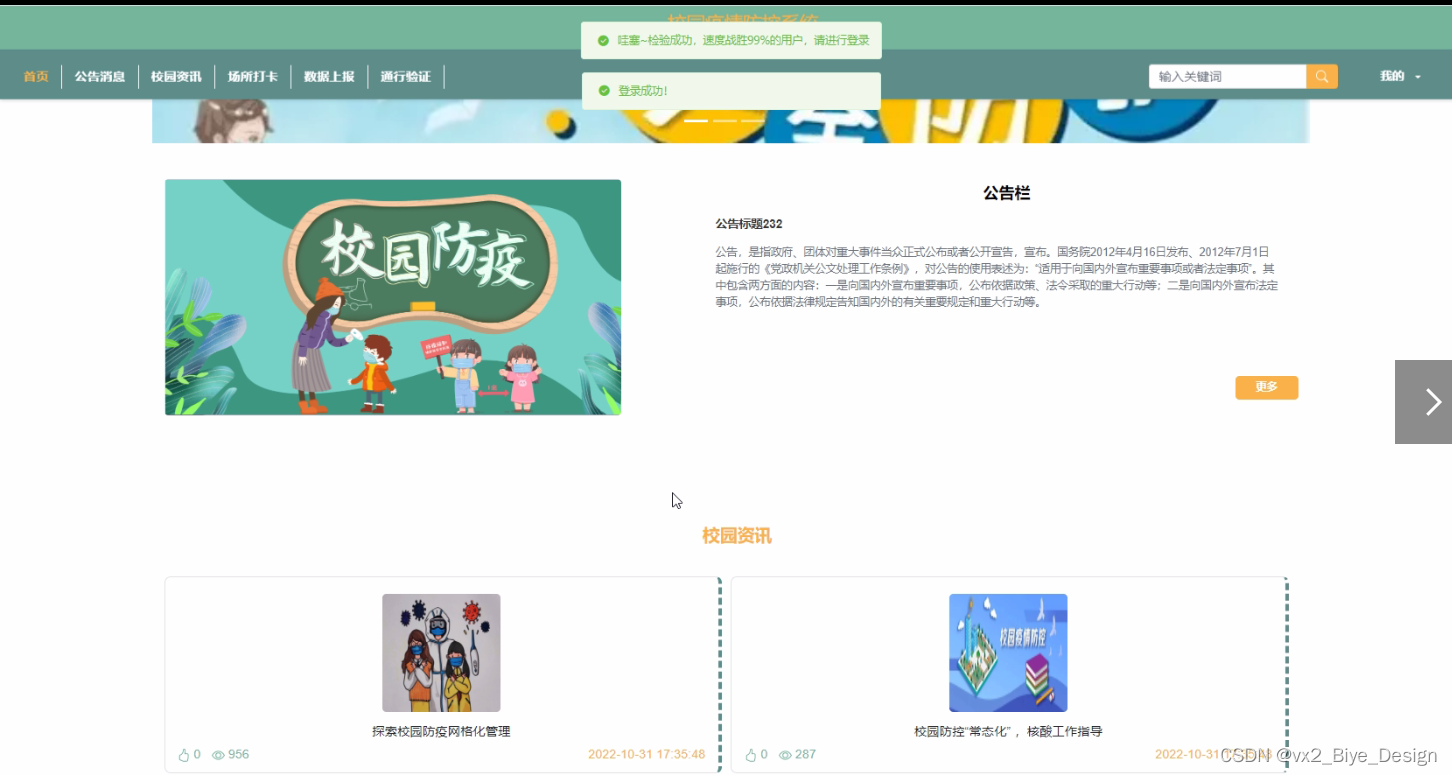校园疫情防控系统主要功能模块包括首页、网站管理(轮播图、公告栏)人员管理(管理员、注册用户)内容管理(校园资讯、资讯分类列表)模块管理(场所打卡、数据上报、通行验证、数据报表、数据分析)个人管理、系统管理,采取面对对象的开发模式进行软件的开发和硬体的架设,能很好的满足实际使用的需求,完善了对应的软体架设以及程序编码的工作,采取MySQL作为后台数据的主要存储单元,采用springboot框架、java技术、Ajax技术进行业务系统的编码及其开发,实现了本系统的全部功能。本次报告,首先分析了研究的背景、作用、意义,为研究工作的合理性打下了基础。针对校园疫情防控系统的各项需求以及技术问题进行分析,证明了系统的必要性和技术可行性,然后对设计系统需要使用的技术软件以及设计思想做了基本的介绍,最后来实现校园疫情防控系统和部署运行使用它。