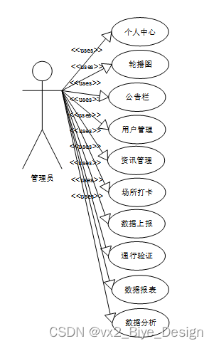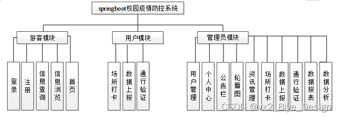 校园疫情防控系统的功能主要分为前台用户根据自己的需求进行注册登录,浏览数据信息并对选中的数据进行上传操作。管理员主要对注册用户,场所打卡、数据上报、通行验证、数据报表、数据分析信息进行处理。