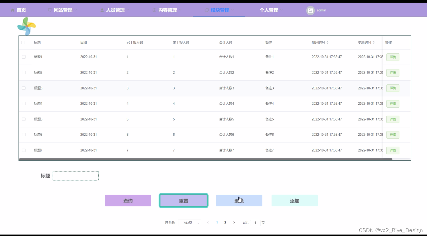 前端部分:前端框架采用了比较流行的渐进式JavaScript框架Vue.js。使用Vue-Router和Vuex实现动态路由和全局状态管理,Ajax实现前后端通信,Element UI组件库使页面快速成型,项目前端通过栅格布局实现响应式,可适应PC端、平板端、手机端等不同屏幕大小尺寸的完美布局展示。