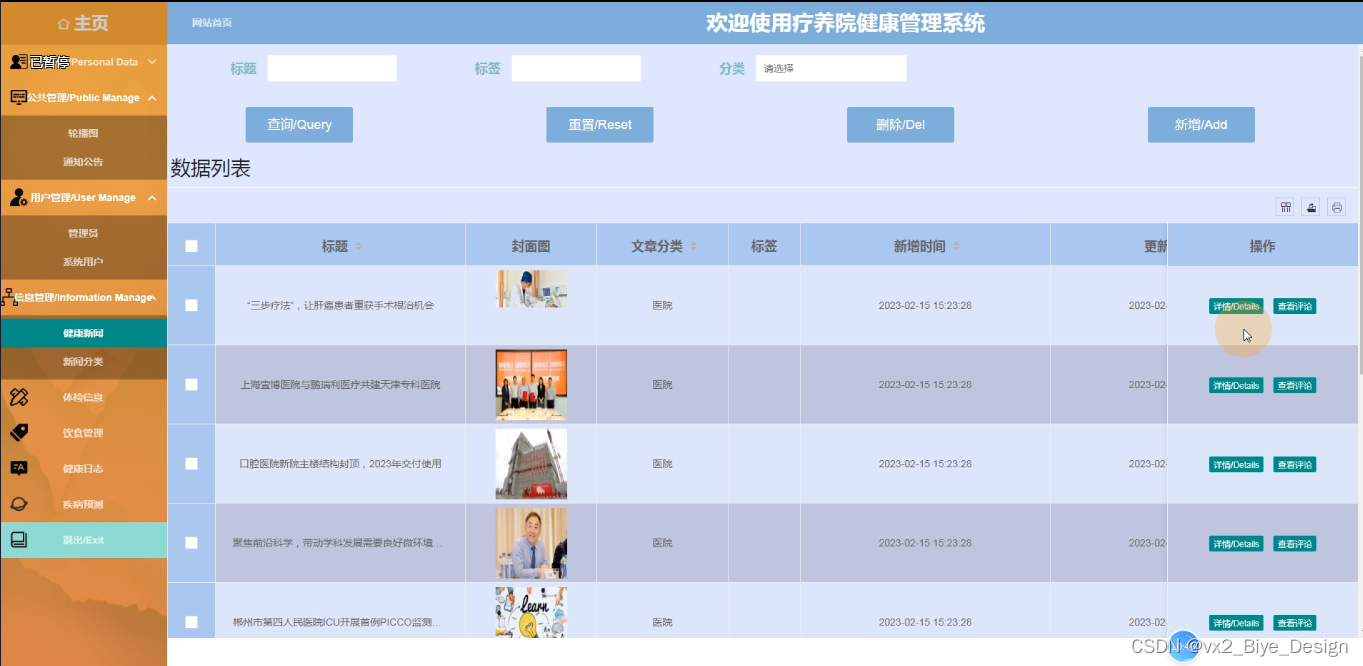 (3)信息管理:管理员可以对疗养院健康管理系统前台展示的健康新闻以及新闻分类进行管控。