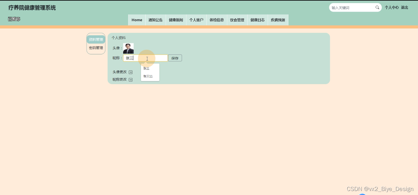 (2)查看疗养院健康管理系统的首页信息:疗养院健康管理系统的首页信息包含了首页、通知公告、健康新闻、个人账户、体检信息、饮食管理、健康日志、疾病预测、个人中心。