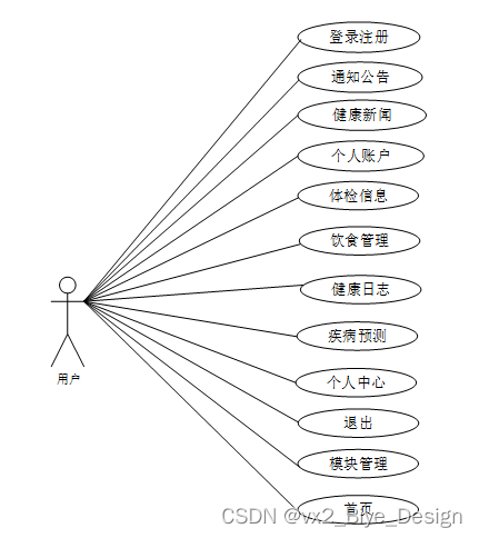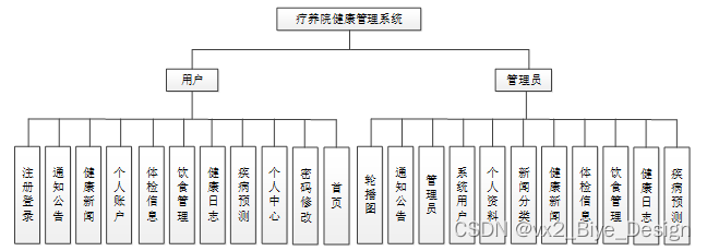 疗养院健康管理系统整体的功能模块包括管理员+系统用户两个模块,其总体设计模块图如图3-1所示。