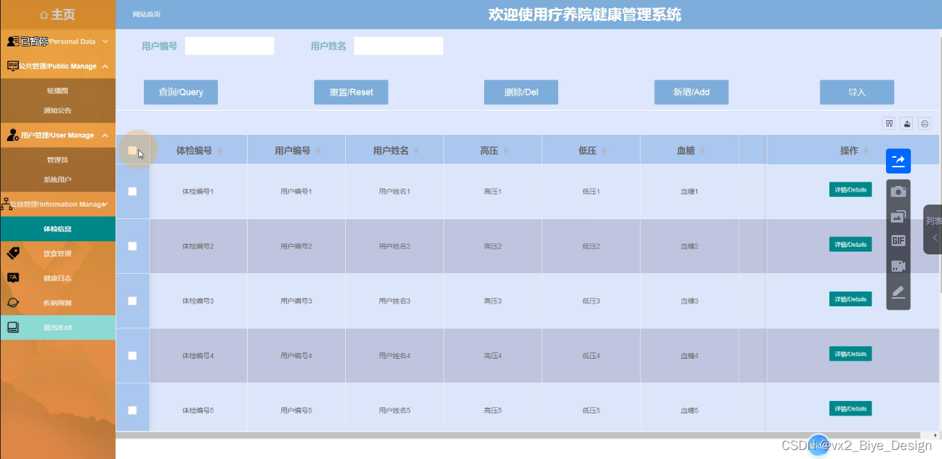 本设计主要实现集人性化、高效率、便捷等优点于一身的疗养院健康管理系统,实现功能:首页、公共管理(轮播图、通知公告)用户管理(管理员、系统用户)信息管理(健康新闻、新闻分类)体检信息、饮食管理、健康日志、疾病预测等功能模块。系统通过浏览器与服务器进行通信,实现数据的交互与变更。只需通过一台电脑,动动手指就可以操作系统,实现数据通信管理。整个系统的设计过程都充分考虑了数据的安全、稳定及可靠等问题,而且操作过程简单。本系统通过科学的管理方式、便捷的服务提高了工作效率,减少了数据存储上的错误和遗漏。