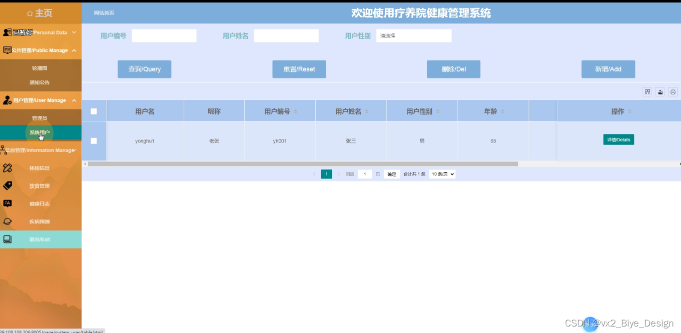 疗养院健康管理系统中的管理员在“用户管理”这一菜单是中可以对注册的系统用户、以及管理员人员进行管控。界面如下图4-10所示。
