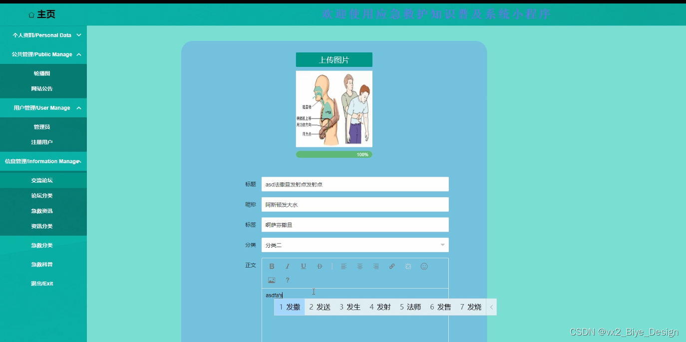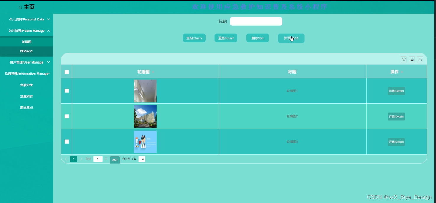 With the rapid development of China's economy, people's demand for mobile phones is increasing, and various mobile software is also widely used. However, for data information management of mobile phones, various software for mobile phones are also highly favored by users. The emergency rescue knowledge popularization system mini program is widely used by users, in order to facilitate users to easily manage the data information of the emergency rescue knowledge popularization system mini program at any time, We have developed a management system based on the emergency rescue knowledge popularization system mini program.