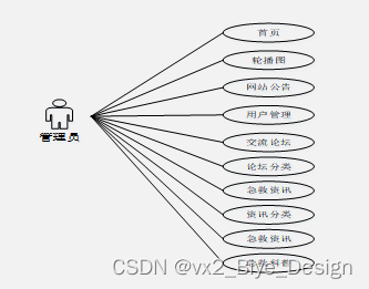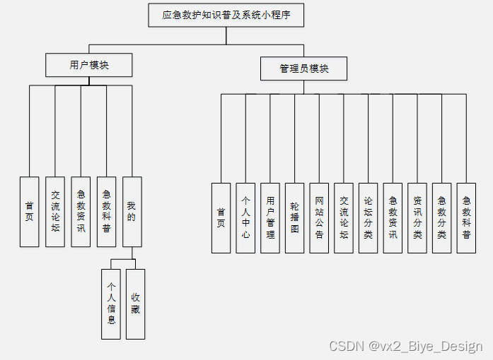 基于应急救护知识普及系统小程序基于现有的手机,可以实现管理员,首页、个人资料、公共管理(轮播图、网站公告)信息管理(交流论坛、论坛分类、急救资讯、资讯分类)急救分类、急救科普等详细的了解及统计分析。根据系统功能需求建立的模块关系图如下图: