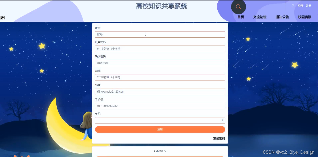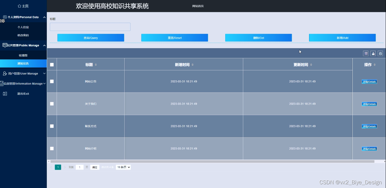 The main functional modules of the university knowledge sharing system include user management, notification and announcement management, communication forums, forum classification, campus information, and personal information. It adopts an object-oriented development model for software development and hardware installation, which can effectively meet the actual needs of use. It improves the corresponding software installation and program coding work, adopts MySQL as the main storage unit for backend data, and adopts the SSM framework Java technology and Ajax technology have been used to code and develop business systems, achieving all the functions of this system. This report first analyzes the background, role, and significance of the research, laying the foundation for the rationality of the research work. Analyze the various requirements and technical issues of the university knowledge sharing system, prove the necessity and technical feasibility of the system, and then provide a basic introduction to the technical software and design ideas required for designing the system. Finally, implement the university knowledge sharing system and deploy it for operation.