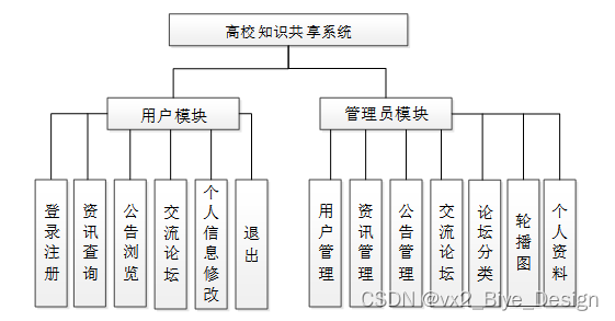 (3)确定好系统使用的技术,进行在线确认系统所划分的用户触,并且根据用户触划分确定所要设计的功能模块,对高校知识共享系统的设计主要划分别为管理员和用户触,并所使用的功能模块也相应不同,但系统的数据库实现的内容是交互的,驴可以随时根据自己的需求进行信息搜索,对于系统工作人员可以根据自己的分管内容进行在线信息的处理及操作,管理员获取到所有用户的详细数据信息,并根据需求进行第一时间处理解决。