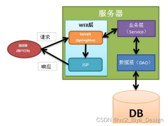 页面发送请求给控制器,控制器调用业务层处理逻辑,逻辑层向持久层发送请求,持久层与数据库交互,后将结果返回给业务层,业务层将处理逻辑发送给控制器,控制器再调用视图展现数据。