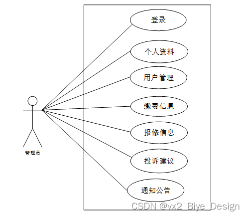 小区物业管理系统中管理员角色用例图如图2.2所示: