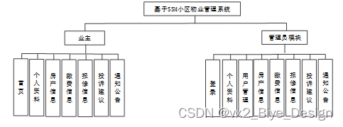 系统的整体架构确定以后,再来看小区物业管理系统的主要功能模块图。整体的功能模块包括管理员+业主用户两个模块,实现的模块主要有用户管理、房产信息、缴费信息、报修信息、投诉建议、通知公告等。