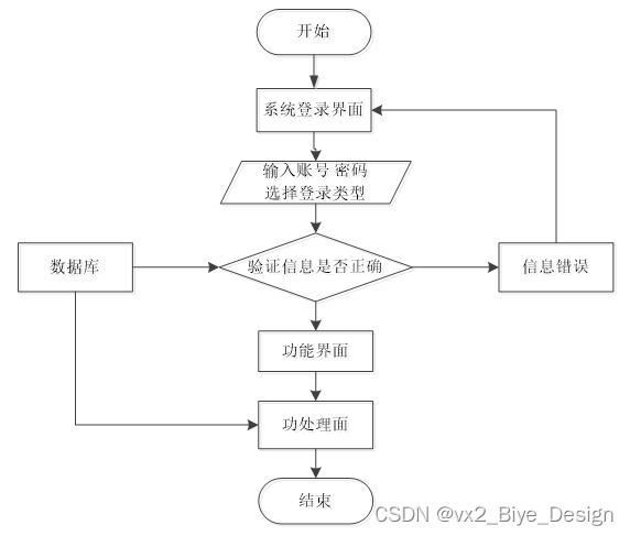 用户想进入系统,首先进入系统登录界面,通过正确的用户名、密码,选择登录类型登录,系统会检查登录信息,信息正确,然后输入相应的功能界面,提示信息错误,登录失败。系统操作流程如图3-3所示。