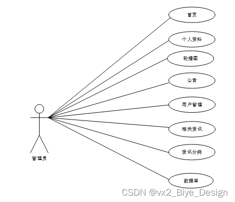 管理员登录后可进行系统首页、个人资料(个人信息。修改密码)、公共管理(轮播图、公告)、用户管理(管理员、系统用户)、信息管理(相关资讯、资讯分类)、数据库管理,管理员用户的用例如图3-1所示。