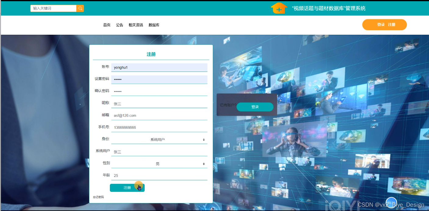 系统管理也都将通过计算机进行整体智能化操作,对于“视频话题与题材数据库”管理系统所牵扯的管理及数据保存都是非常多的,例如首页、个人资料(个人信息。修改密码)、公共管理(轮播图、公告)、用户管理(管理员、系统用户)、信息管理(相关资讯、资讯分类)、数据库等功能,都是通过笔记的方式进行详细信息的统计,后来出现电脑,通过电脑输入软件将纸质的信息统计到电脑上,这种方式比较传统,而且想要统计数据信息比较麻烦,还受时间和空间的影响,所以为此开发了“视频话题与题材数据库”管理系统;为用户提供了方便管理平台,方便管理员查看及维护,并且可以通过需求进行设备信息内容的编辑及维护等;对于用户而言,可以随时进行查看出勤和成绩信息,管理员可以足不出户就可以获取到系统的数据信息等,而且还能节省用户很多时间,所以开发“视频话题与题材数据库”管理系统给管理者带来了很大的方便,同时也方便管理员对用户信息进行处理。