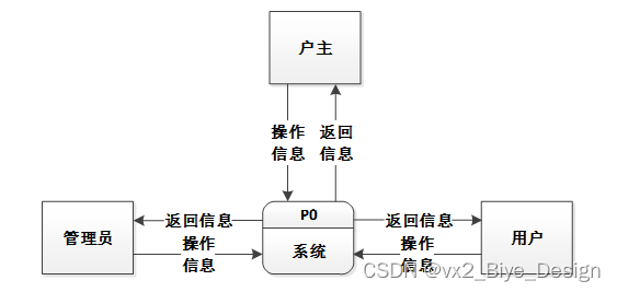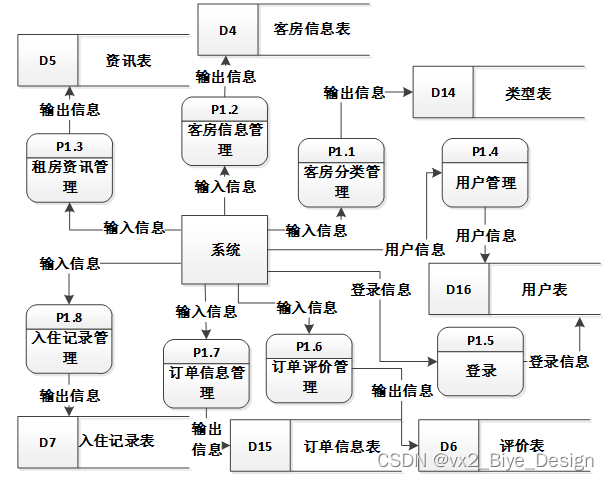 二层数据流程是对一层数据流层图中填写登录注册信息、用户功能的细化。即:填写登录注册信息细化为填制信息、后台审核,用户功能细化为浏览租房资讯、客房信息、入住信息等操作。