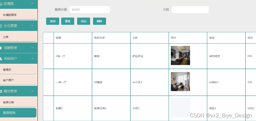 房源信息管理,户主可以发布房源信息。可查看、修改或删除房源信息。