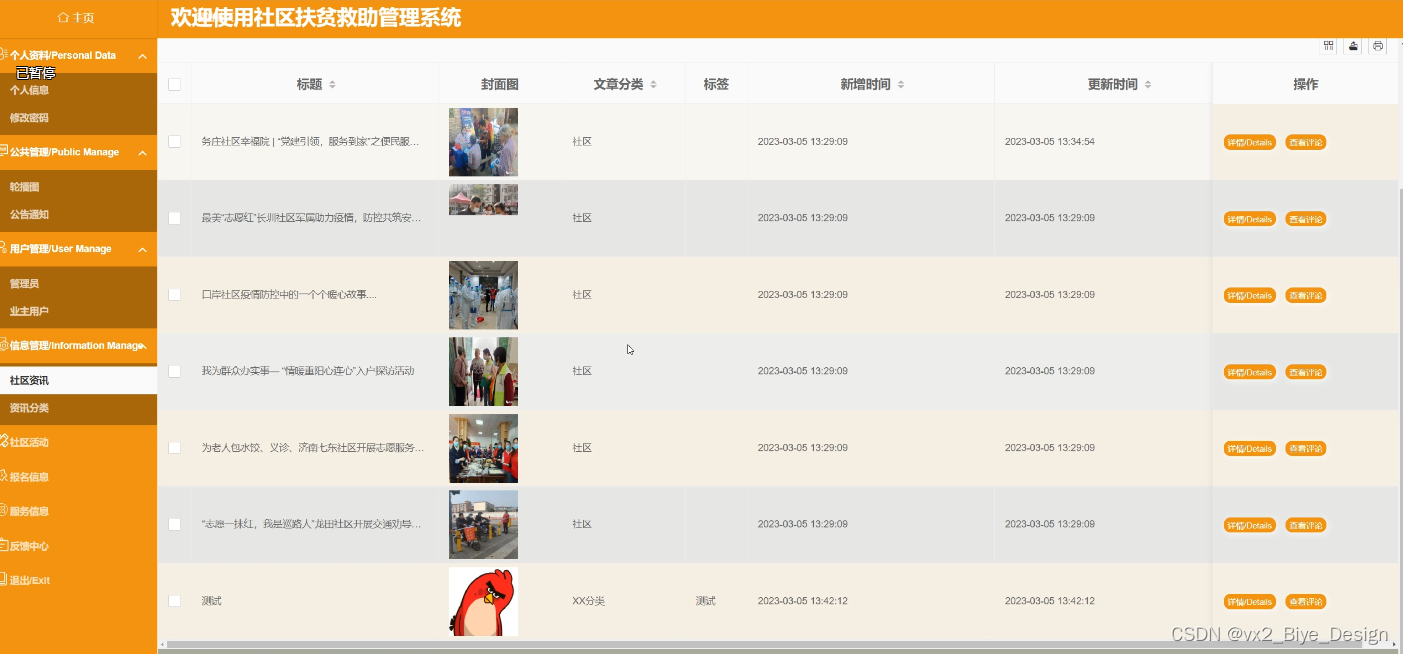 (3)信息管理:管理员可以对社区扶贫救助管理系统前台展示的社区资讯以及资讯分类进行管控。