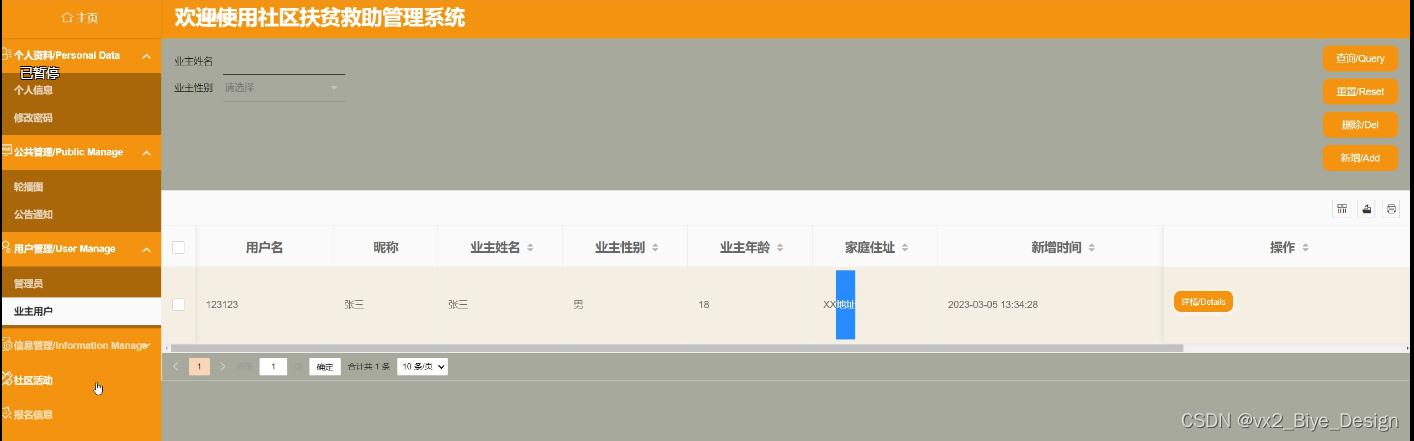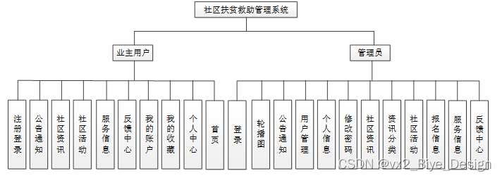 社区扶贫救助管理系统划分为了业主用户模块和管理员模块这两大部分。