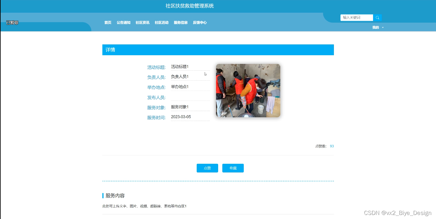 用户可以查看社区活动,在查询到自己想要了解的社区活动的时候,可以进入查看详细的介绍,点击“报名”这一按钮以后会跳转到报名信息填写的界面,根据提示填写好报名的信息,点击“提交”以后报名就完成了,在社区活动详情这个界面,同时支持用户对喜欢的社区活动进行收藏、点赞的功能,社区活动详情展示页面如图4-4所示。