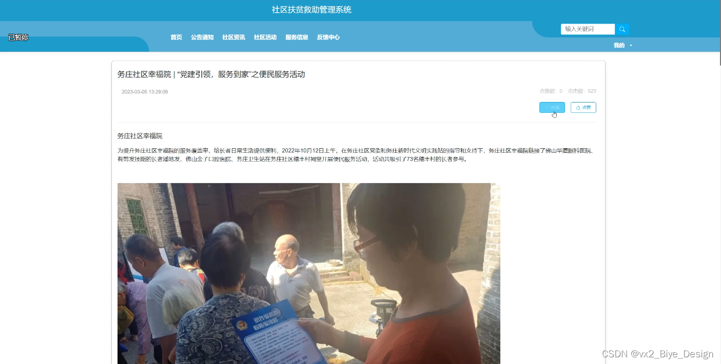 当访客点击社区扶贫救助管理系统 中导航栏上的“社区资讯”后将会进入到该“社区资讯”列表的界面,然后选择想要看的社区资讯信息,点击进入到详细界面,在详细界面可以收藏+点赞+评论等操作,社区资讯界面如下图4-6所示。