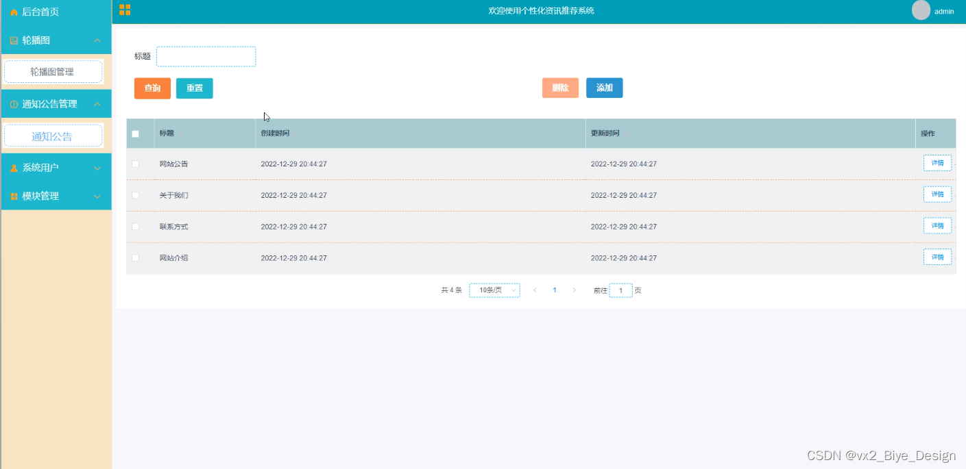 通知公告管理,在通知公告管理页面中可以对索引、标题等信息进行详情、查询、删除等详细操作,如图5-12所示。