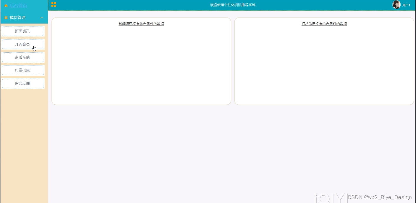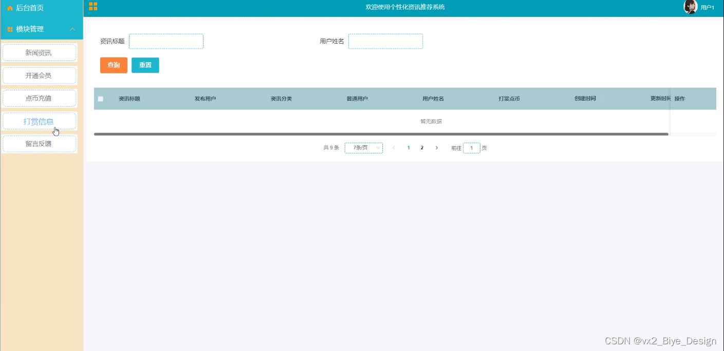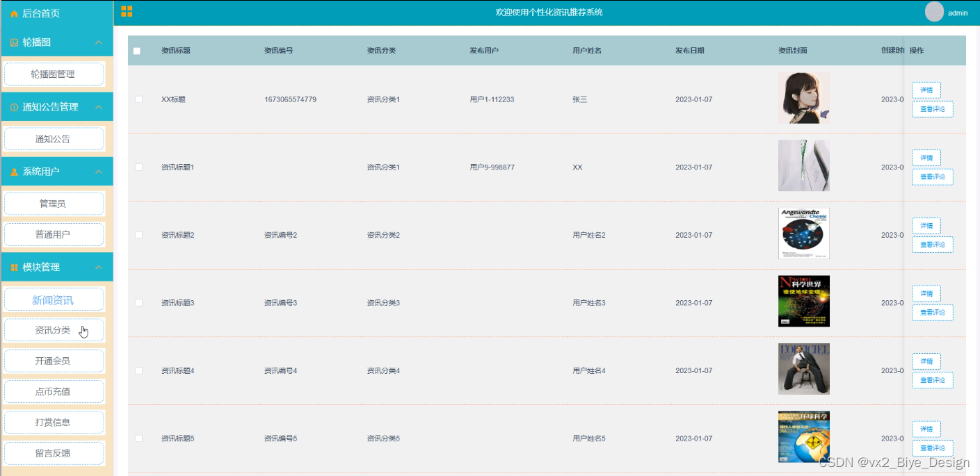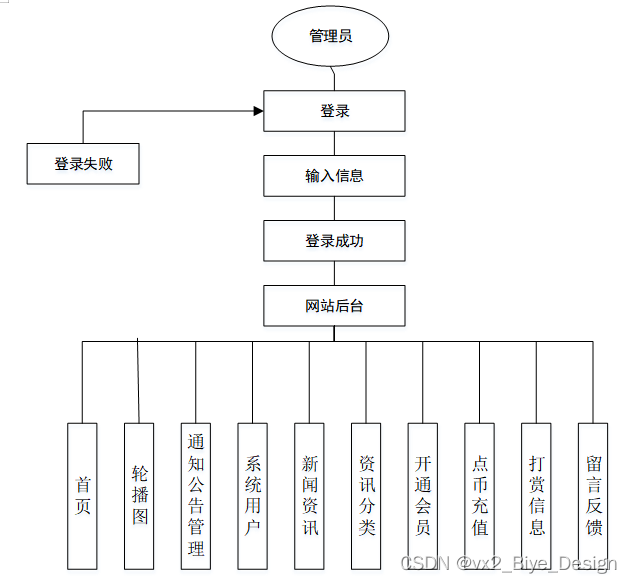 (1)功能要求:可以管理后台首页、轮播图(轮播图管理)、通知公告管理(通知公告)、系统用户(管理员、普通用户)、模块管理(新闻资讯、资讯分类、开通会员、点币充值、打赏信息、留言反馈)等功能模块。