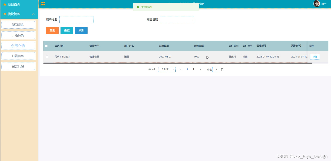 点币充值,在点币充值页面中通过填写普通用户、会员类型、用户姓名、充值日期、充值金额、支付状态、支付类型等信息,根据详情进行添加、查询等操作,如图5-7所示。