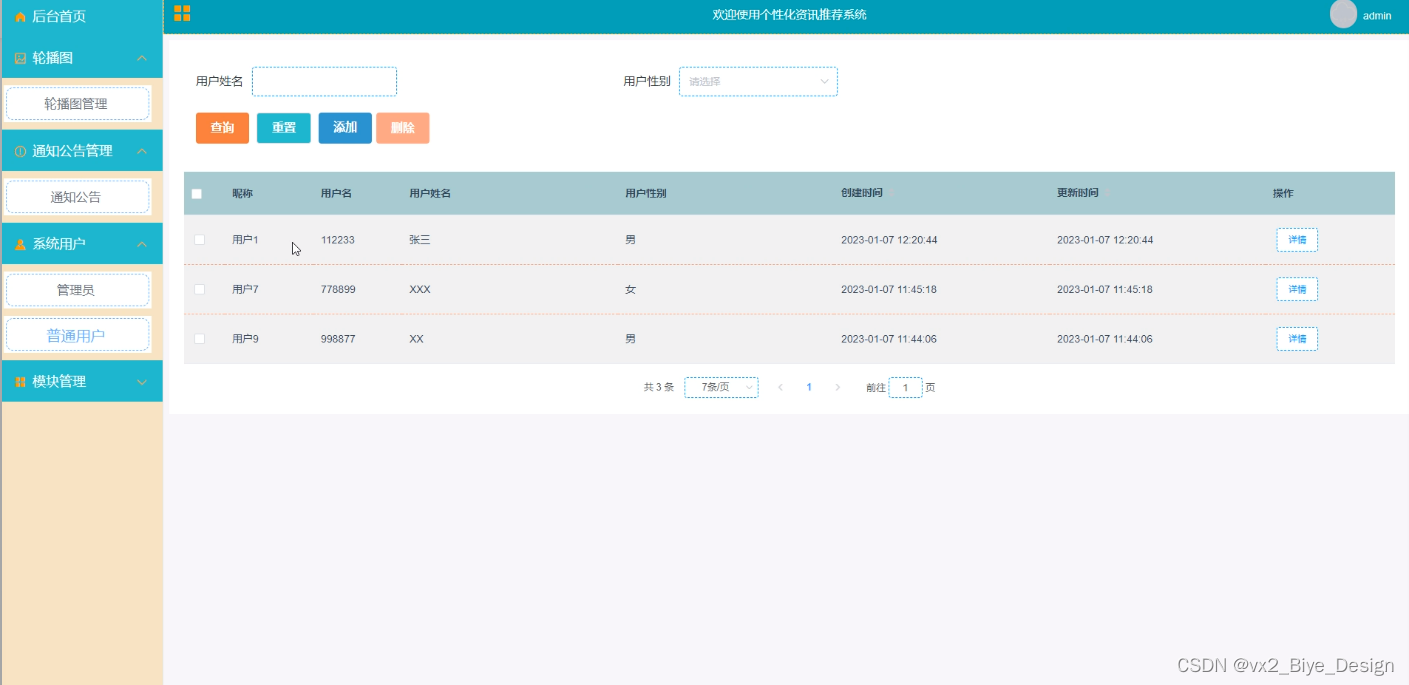 用户管理,在用户管理页面中可以对索引、昵称、用户名、用户姓名、用户性别等信息进行详情、添加或删除等详细操作,如图5-13所示。