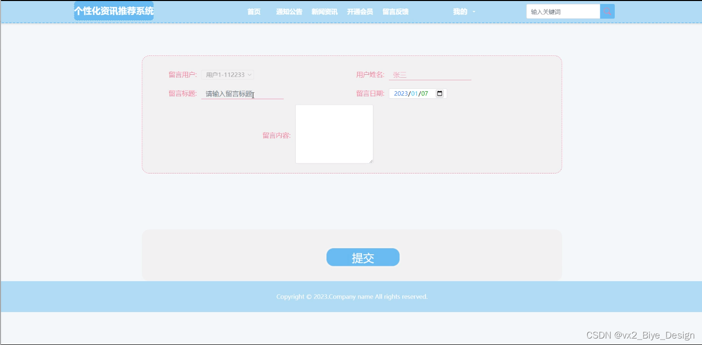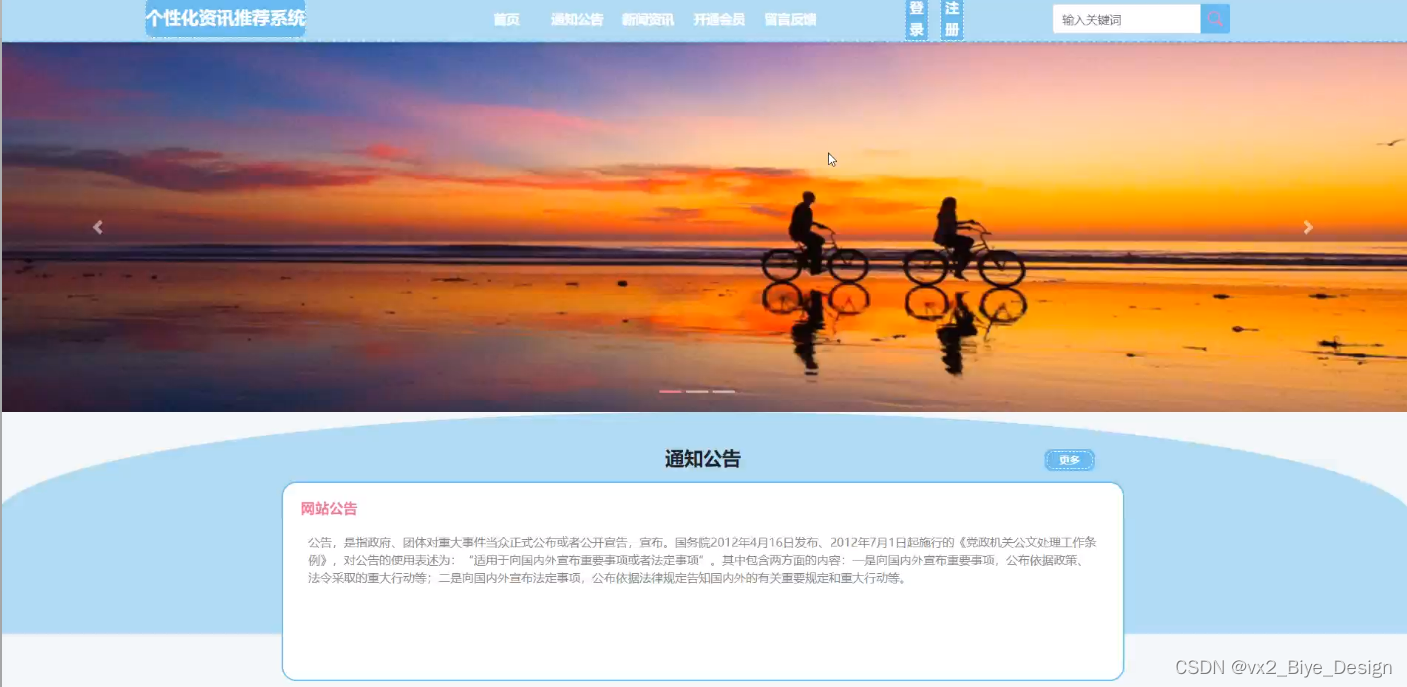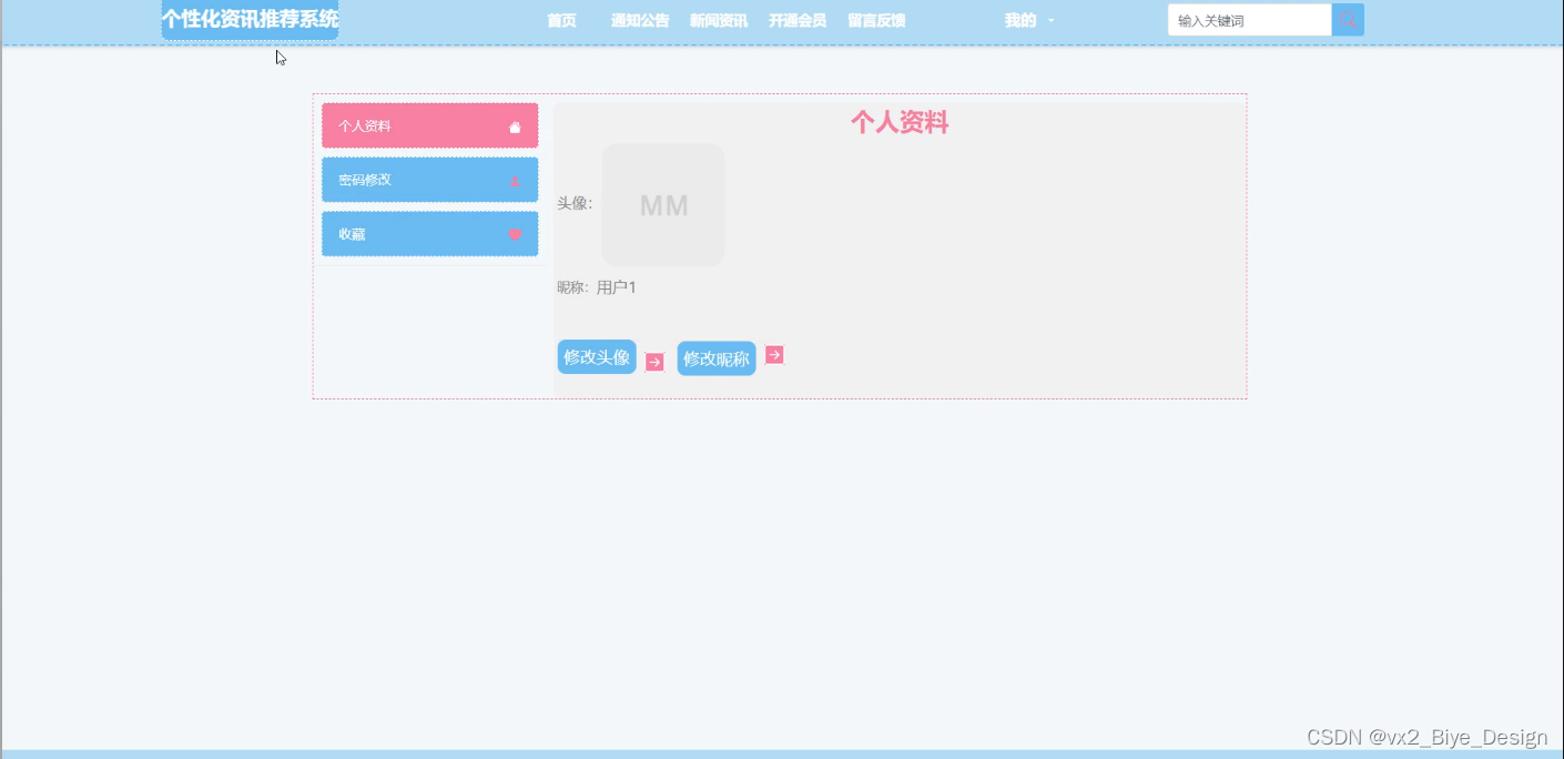 个性化资讯推荐系统,在系统首页可以查看首页、通知公告、新闻资讯、开通会员、留言反馈、我的等内容进行操作,如图5-1所示。