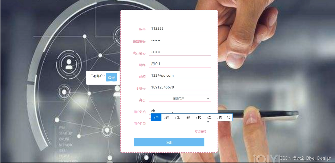 用户注册,在用户注册页面通过填写账户、设置密码、确认密码、昵称、邮箱、手机号、身份、用户姓名、用户性别等信息完成用户注册,如图5-4所示。在个人中心页面通过填写个人资料、密码修改、收藏等信息进行信息更新操作,还可以根据需要进行相应操作;如图5-5所示。