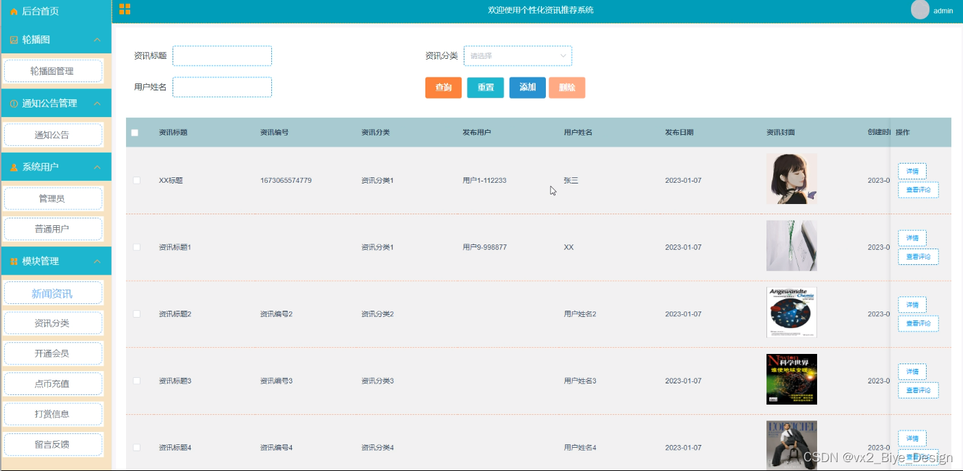 新闻资讯管理,在新闻资讯管理页面中可以对索引、资讯标题、资讯编号、资讯分类、发布用户、用户姓名、发布日期、资讯封面等信息,根据详情查看评论进行添加或删除等操作,如图5-11所示。