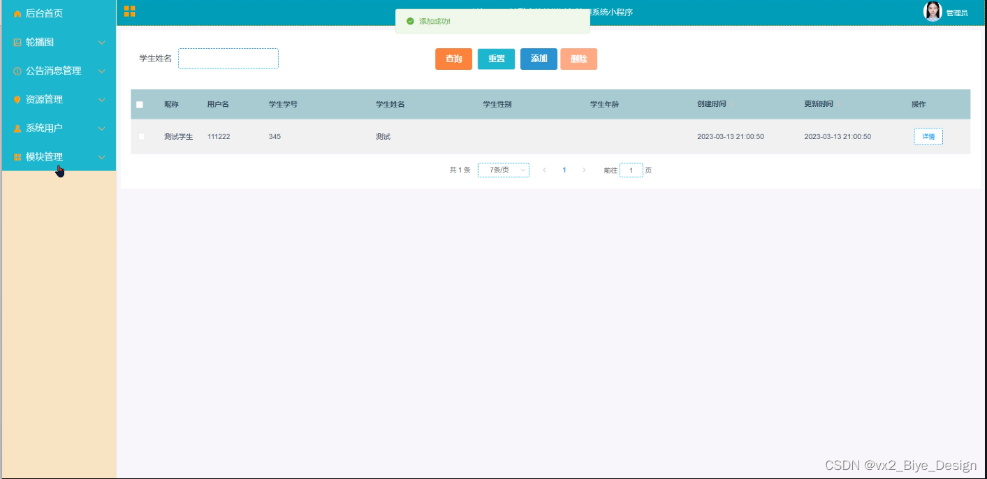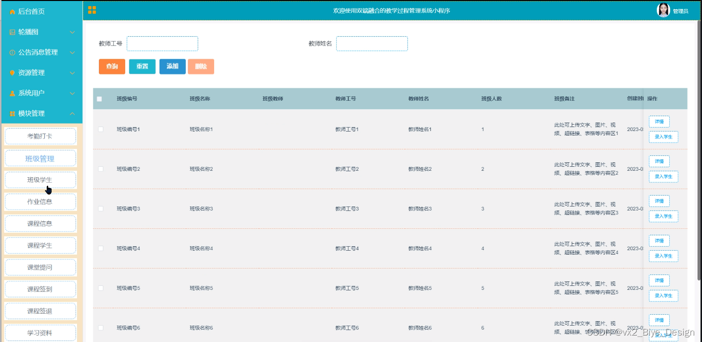 在管理员功能页面可以查看管理员:首页、轮播图(轮播图管理)、公告消息管理(公告消息)、资源管理(课程资讯、资讯分类、考试测验)、系统用户(管理员、教师用户、学生用户)、模块管理(考勤打卡、班级管理、班级学生、作业信息、课程信息、课程学生、课堂提问、课程签到、课程签退、学生资料)等内容进行相对应操作,如图5-8所示。