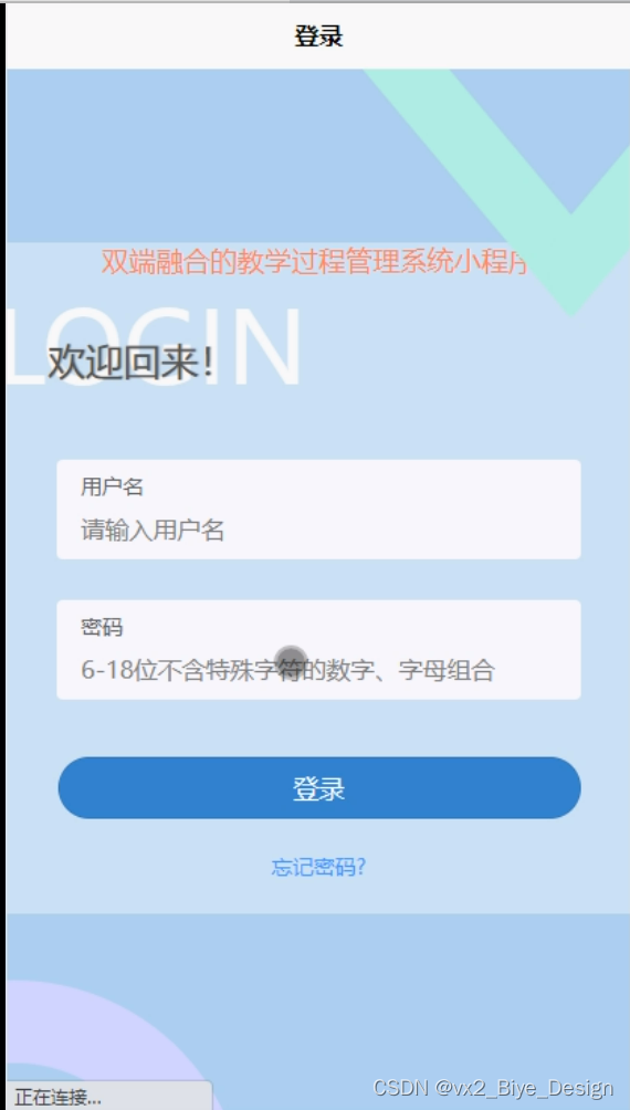 双端融合的教学过程管理系统小程序采用了SPRINGBOOT技术,开发了功能完备、使用简单的前端应用程序,并建立、维护了一个数据完整、安全、稳定性强的后台数据库系统。