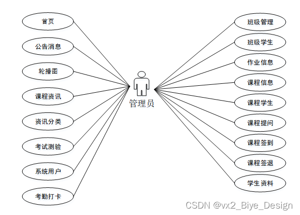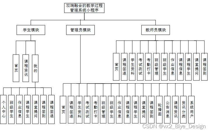 基于双端融合的教学过程管理系统小程序的设计基于现有的手机,可以实现管理员首页、轮播图(轮播图管理)、公告消息管理(公告消息)、资源管理(课程资讯、资讯分类、考试测验)、系统用户(管理员、教师用户、学生用户)、模块管理(考勤打卡、班级管理、班级学生、作业信息、课程信息、课程学生、课堂提问、课程签到、课程签退、学生资料)等详细的了解及统计分析。根据系统功能需求建立的模块关系图如下图: