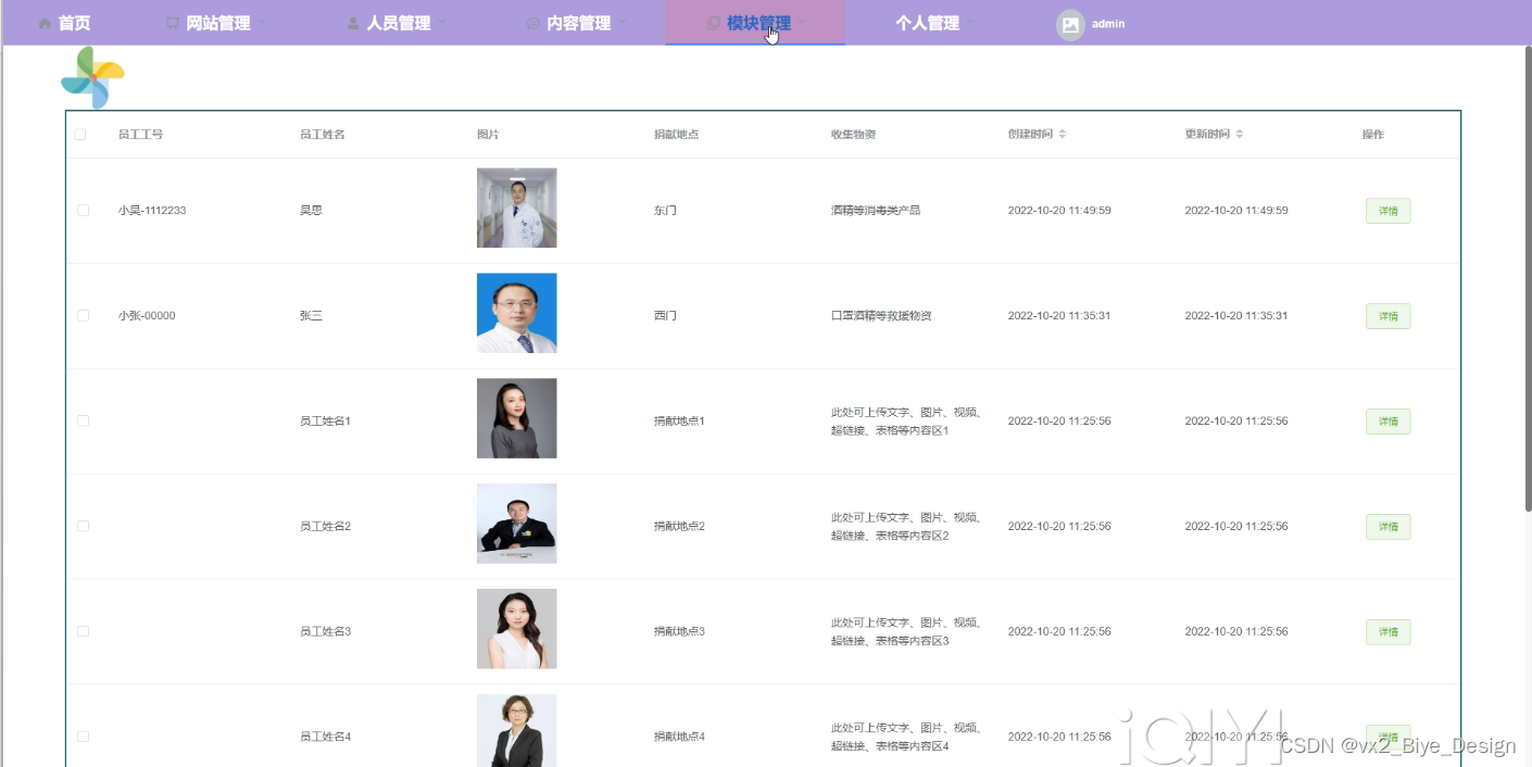 捐献点,在捐献点页面查看员工工号、员工姓名、图片、捐献地点、收集物资、等信息,并可根据需要进行详情添加、修改或删除操作,如图5-11所示。