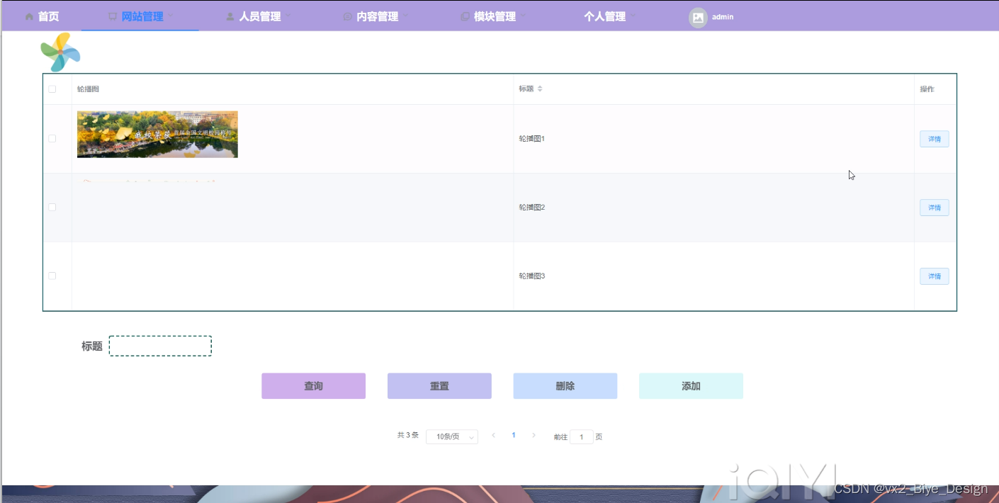 网站管理,在网站管理页面可以查看索引、轮播图、标题等信息,并可根据需要进行详情添加、修改或删除操作,如图5-9所示。
