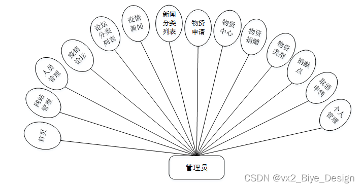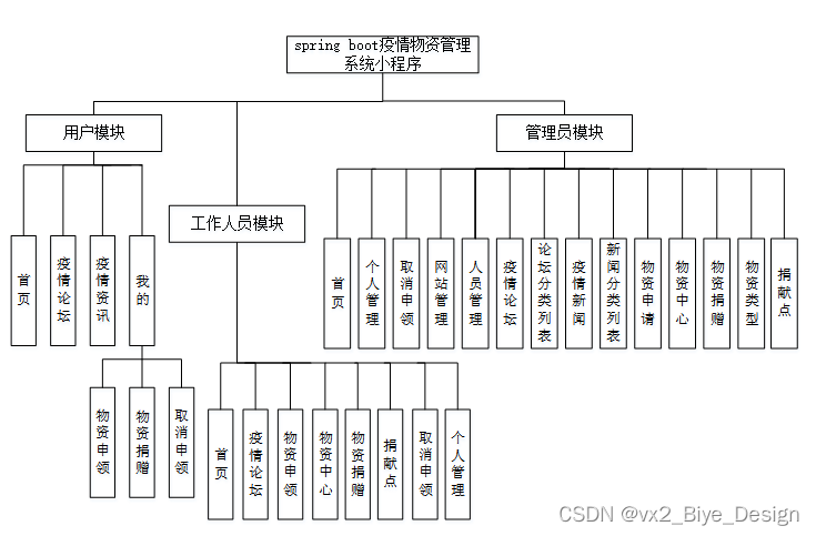 基于疫情物资管理系统小程序 的设计基于现有的手机,可以实现管理员首页、网站管理(轮播图)、人员管理(管理员、系统用户、工作人员)、内容管理(疫情论坛、论坛分类列表、疫情新闻、新闻分类列表)、模块管理(物资申请、物资中心、物资捐赠、物资类型、捐献点、取消申领)、个人管理等详细的了解及统计分析。根据系统功能需求建立的模块关系图如下图: