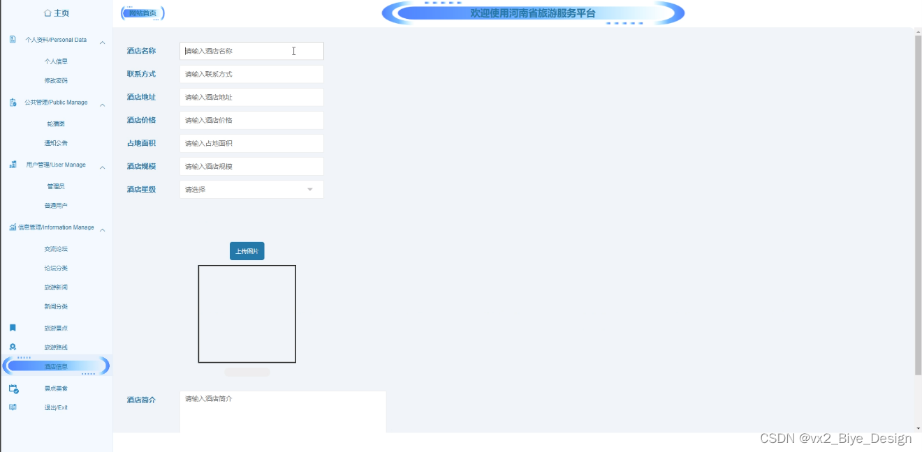 酒店信息管理:对酒店信息进行维护,添加、删除、修改信息。