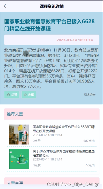 (4)课程资讯:当用户点击“课程资讯”这一菜单按钮,会显示管理员在后台发布的所有的课程资讯,可以查看详情,进行收藏、点赞、评论等;